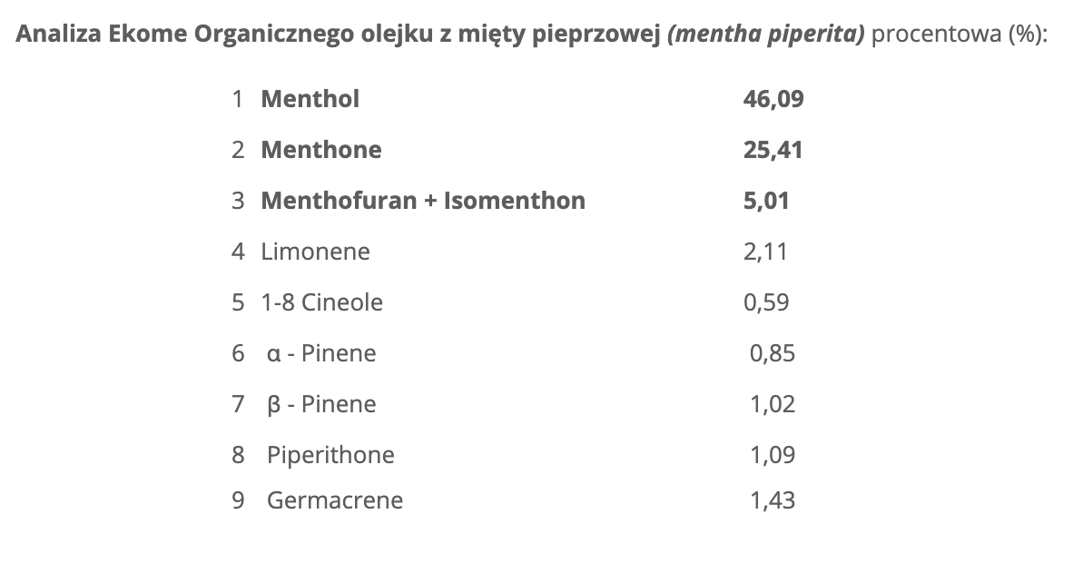 Analiza Ekome Organicznego olejku z mięty pieprzowej (mentha piperita) procentowa (%):