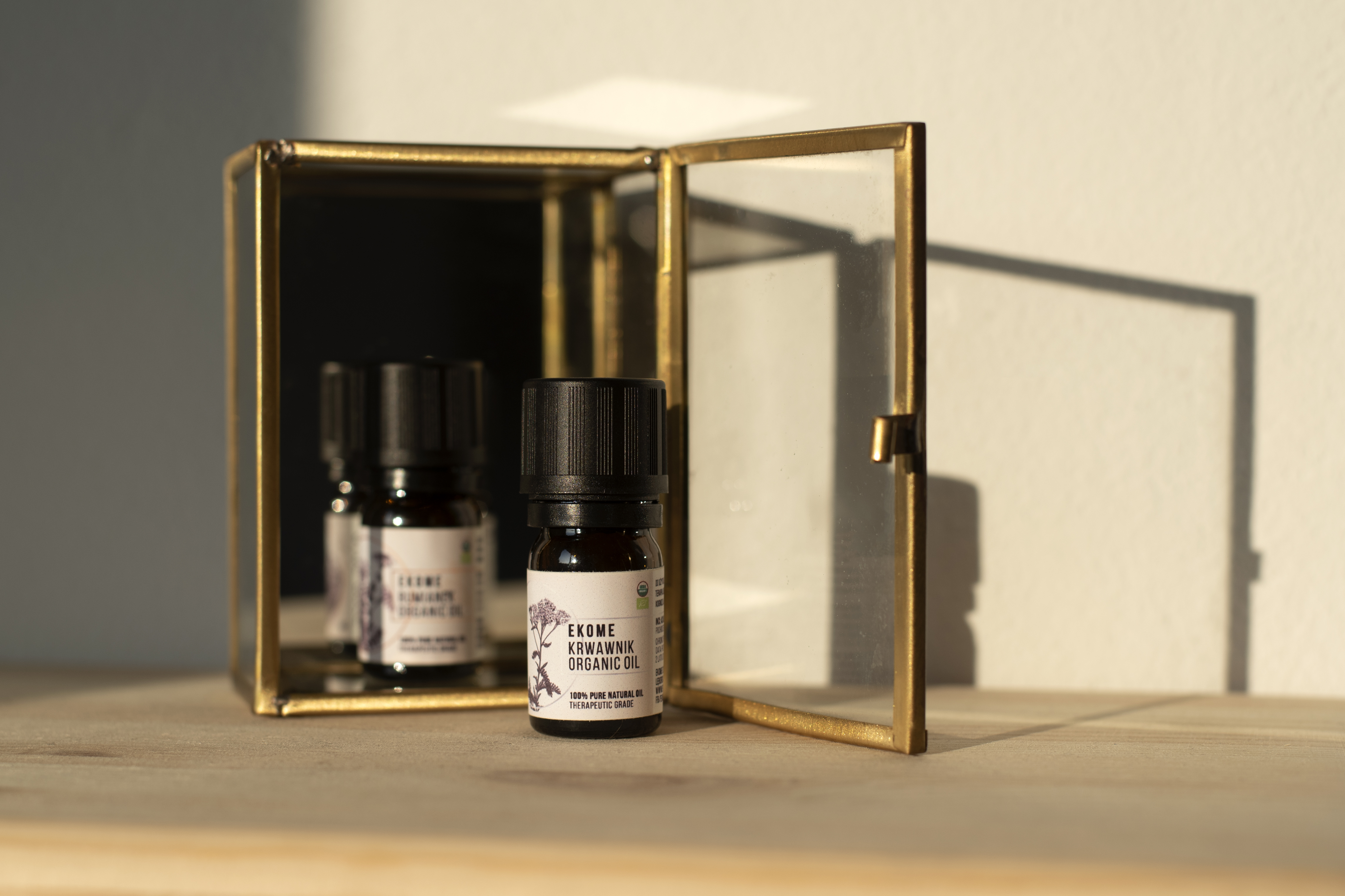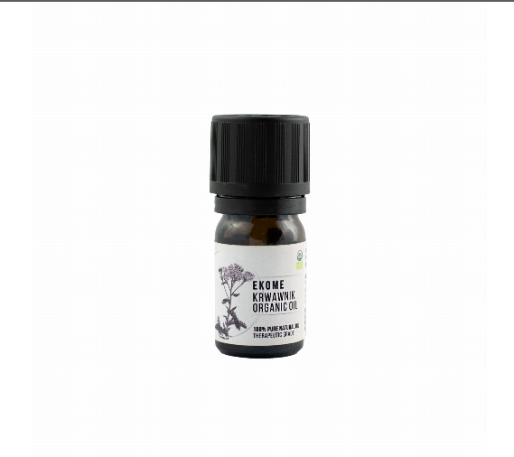 Ekome Organiczny olejek eteryczny krwawnikowy (Achillea millefolium). Jakość terapeutyczna, olejek certyfikowany, pochodzący z surowców z kontrolowanych upraw ekologicznych.