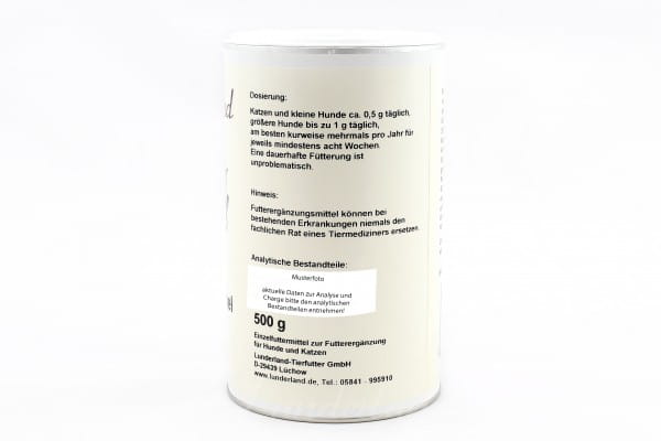 Dawkowanie: W celu codziennego wspierania stawów: koty i małe psy ok. 0,5 g dziennie; większe psy 1 g dziennie. Dla najlepszego efektu mączkę z małży należy stosować kilka razy w roku minimum 8 tygodni.