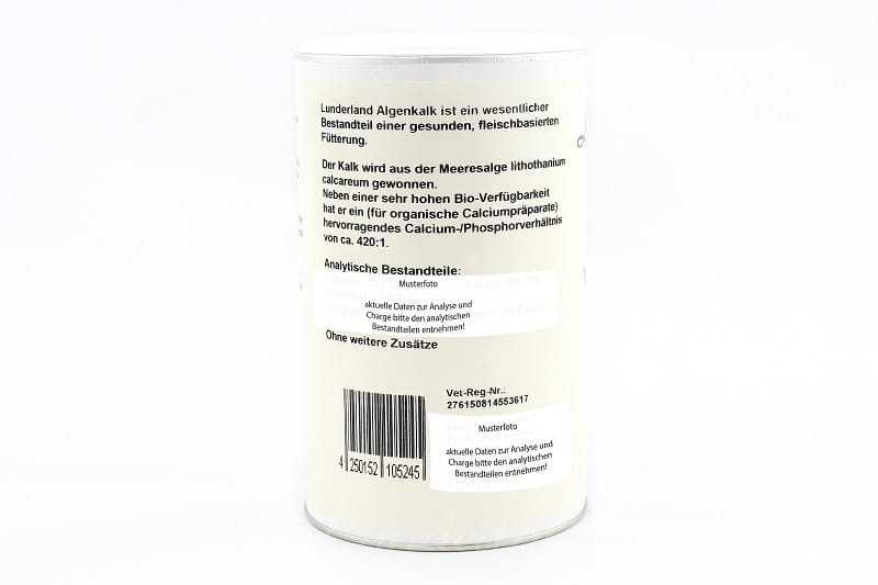 Wapń z alg (Algenkalk) jest to w 100% naturalny suplement wapniowy stanowiący doskonałe źródło wysokowchłanialnego wapnia dla psów i kotów karmionych dietą BARF, a także potrzebujących uzupełnienia tego pierwiastka. Nie zawiera żadnych dodatków, antyzbrylaczy ani barwników.