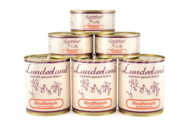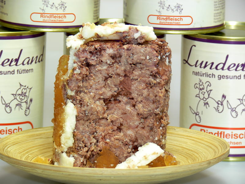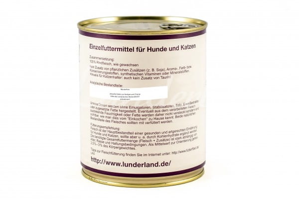 - Nie zawiera żadnych barwników, dodatków smakowych, konserwantów czy dodatku syntetycznych witamin i minerałów (w tym także tauryny) z tego też względu nie powinny być same w sobie przez dłuższy czas wyłączną podstawą diety bez odpowiedniej suplementacji. Dzięki temu, iż karma mokra dla psów i kotów Lunderland wołowina marmurkowa mięso 100% produkowana jest bez żadnych sztucznych dodatków i wypełniaczy, świetnie nadaje się jako uzupełnienie dla psów i kotów cierpiących na alergię lub nietolerancję pokarmową, jako podstawa do przeprowadzenia diety eliminacyjnej pod okiem lekarza weterynarii, a także jako urozmaicenie diety BARF (polecana podczas wyjazdów), czy też uzupełnienie codziennej diety opartej na pełnowartościowej karmie suchej w wysokiej jakości posiłek mięsny. Mięso z puszki można także łączyć z płatkami warzywnymi Lunderland.